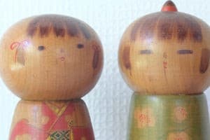 Come la coppia precedente anche questa coppia di bambole kokeshi sono un bambino ed una bambina. Però diversamente da Murakami san, l’artigiana Eiko Shibata per distinguere i generi della coppia crea alcune diversità nella forma dei due kokeshi.