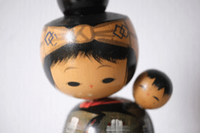 Il primo kokeshi di “Oshin” in mostra è una creazione dell’artigiano Miyashita Hajime. È un kokeshi colorato che mostra una bambina che accudisce un bambino in fasce portandolo sulla schiena.
